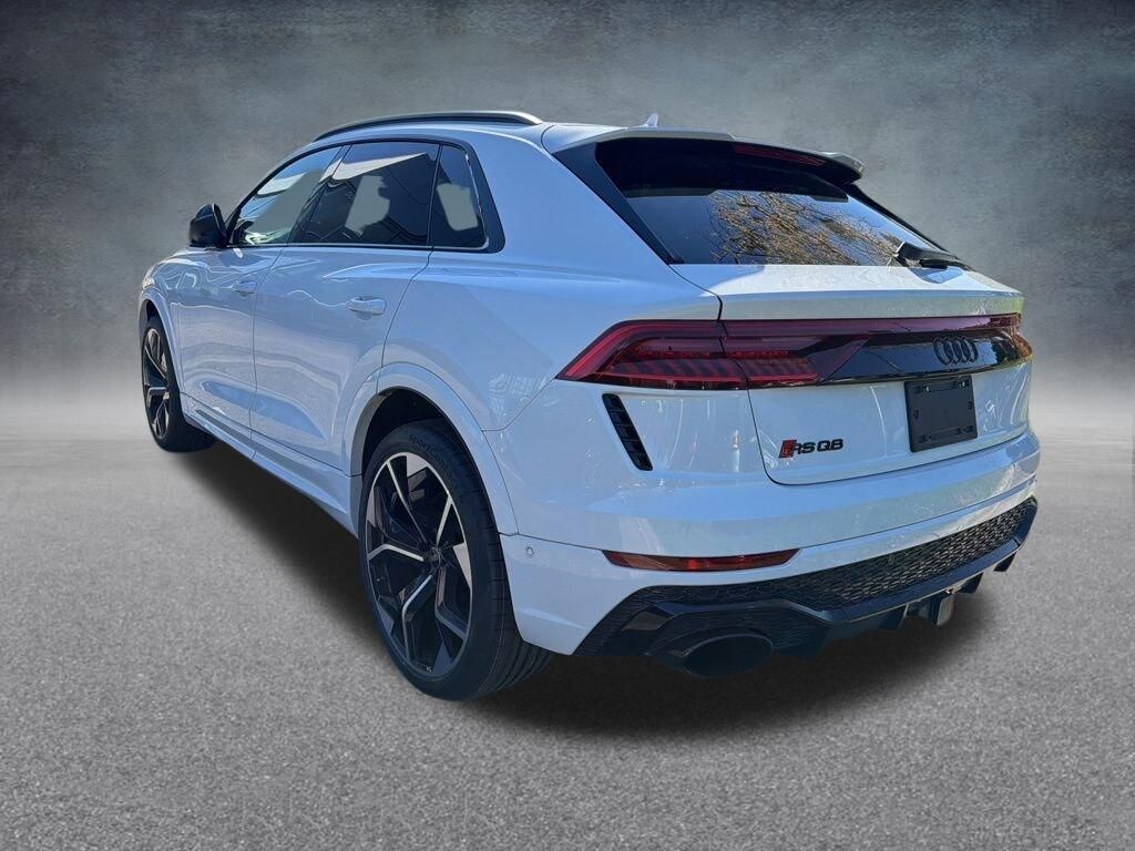 Glacier White Metallic 2023 Audi RS Q8 4.0T quattro 8-Speed Automatic with Tiptronic 4.0L V8 Turbocharged DOHC 32V LEV3-ULEV125 591hp quattro Bang & Olufsen Advanced Sound System w/3D Sound, Black Dinamica Headliner, Black Mirror Housings, Black Optic Package, Black Roof Rails, Dual-Pane Acoustic Glass for Side Windows, Executive Package, Head-Up Display, Heated Rear Seats, Intersection Assist, Luxury Package, Massage Function for Front Seats, Power Soft-Closing Doors, Remote Park Assist Plus, Sport Exhaust System w/Black Tips, Towing 7 Pin Connector, Traffic Sign Recognition, Wheels: 23" Audi Sport 5 Y-Spoke Rotor Design.