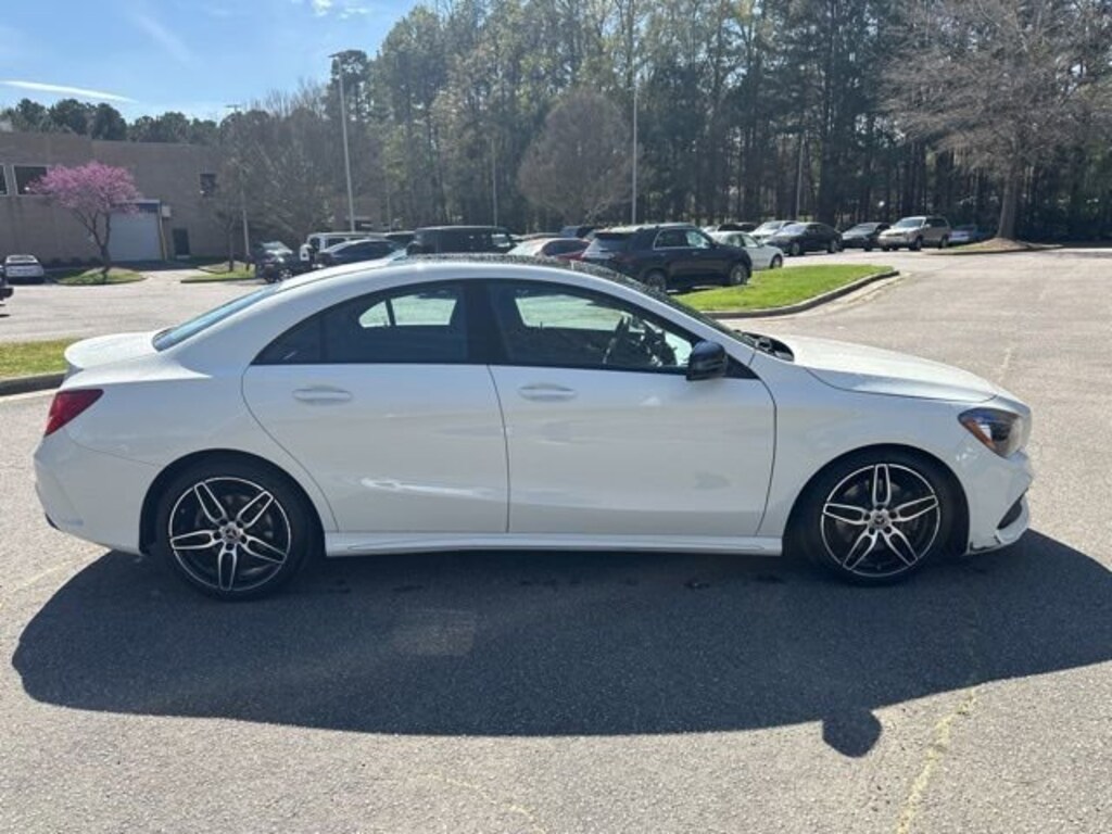 White 2018 Mercedes-Benz CLA CLA 250 4MATIC® 2.0L I4 Turbocharged 17 5-Spoke Alloy Wheels, 4-Wheel Disc Brakes, 8 Speakers, 8 Color Display Upgrade, ABS brakes, Air Conditioning, Alloy wheels, AM/FM radio, AMG® Body Styling, AMG® Line Exterior, Automatic temperature control, Black Headliner, Blind Spot Assist, Brake assist, Bumpers: body-color, CD player, Child-Seat-Sensing Airbag, Delay-off headlights, Driver door bin, Driver vanity mirror, Dual front impact airbags, Dual front side impact airbags, Electronic Stability Control, Emergency communication system: mbrace, Exterior Parking Camera Rear, Four wheel independent suspension, Front anti-roll bar, Front Bucket Seats, Front Center Armrest, Front dual zone A/C, Front reading lights, Fully automatic headlights, HANDS-FREE ACCESS, Heated door mirrors, Heated Front Seats, Illuminated entry, KEYLESS GO®, Knee airbag, Low tire pressure warning, MB-Tex Leatherette Seat Trim, Memory seat, Night Package, Occupant sensing airbag, Outside temperature display, Overhead airbag, Overhead console, Panic alarm, Panorama Sunroof, Passenger door bin, Passenger vanity mirror, Power door mirrors, Power driver seat, Power passenger seat, Power steering, Power windows, Premium Package, Radio data system, Radio: Audio 20 CD w/Garmin Navigation Pre-Wiring, Rain sensing wipers, Rear anti-roll bar, Rear fog lights, Rear reading lights, Rear seat center armrest, Rear window defroster, Remote keyless entry, Security system, Single CD Player, SiriusXM Satellite Radio, Speed control, Speed-sensing steering, Split folding rear seat, Sporty Engine Sound, Steering wheel mounted audio controls, Tachometer, Telescoping steering wheel, Tilt steering wheel, Traction control, Trip computer, Turn signal indicator mirrors, Variably intermittent wipers.