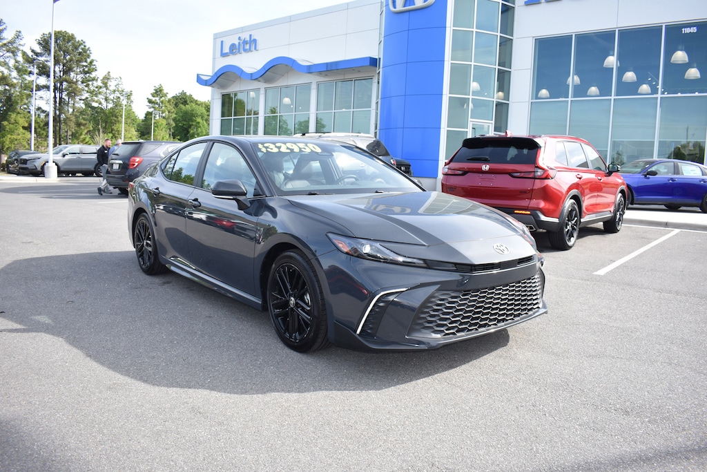 CARFAX One-Owner. Charcoal 2025 Toyota Camry SE FWD eCVT 2.5L 4-Cylinder 16V DOHC ABS brakes, Active Cruise Control, Air Conditioning, Alloy wheels, Apple CarPlay/Android Auto, Auto High-beam Headlights, Auto-Dimming Rearview Mirror w/HomeLink, Automatic temperature control, Bumpers: body-color, Cold Weather Package, Convenience Package, Delay-off headlights, Electronic Stability Control, Exterior Parking Camera Rear, Front Bucket Seats, Front dual zone A/C, Fully automatic headlights, Heated door mirrors, Heated Front Seats, Illuminated entry, Leather Shift Knob, Leather steering wheel, Leather Wrapped Heated Steering Wheel, Low tire pressure warning, Multimedia Upgrade Package, Power door mirrors, Power driver seat, Power steering, Power Tilt/Slide Moonroof, Power windows, Radio: Toyota Audio Multimedia w/12.3" Touchscreen, Rear seat center armrest, Remote keyless entry, Smart Key System, SofTex & Fabric Seat Trim, Split folding rear seat, Spoiler, Steering wheel mounted audio controls, Telescoping steering wheel, Tilt steering wheel, Traction control, Wheels: 18" Black-Finished Alloy.